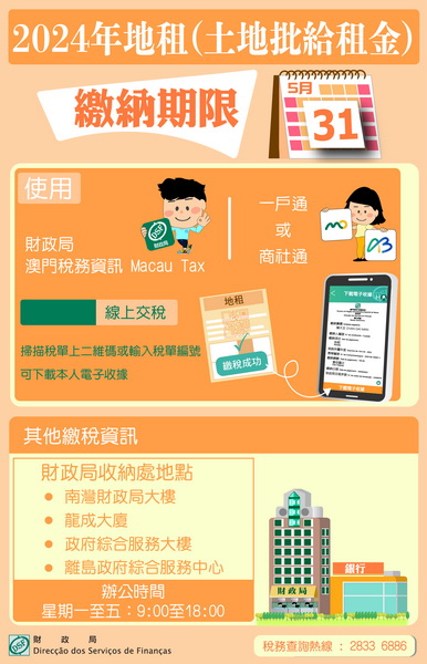 【本報消息】財政局提醒,2024年地租(土地批給租金)的最後繳納期限至5月31日,仍未繳納上述地租的納稅人應儘快繳納,避免因逾期繳納而須附加過期利息和罰款。