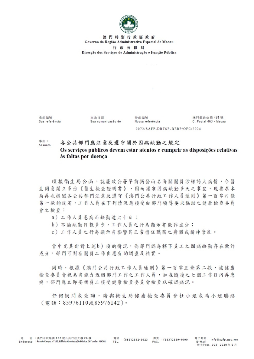 公職局局長吳惠嫻周一簽署中葡文版本的「各公共部門應注意及遵守關於因病缺勤之規定」傳閱公函,表示剛接獲衛生局公函,就廉署早前揭發兩名海關關員涉嫌誇大病情,令醫生同意開立多份俗稱「病假紙」的《醫生檢查證明書》,因而獲准因病缺勤多天的事件,要求公職局再次提醒各公共部門注意及遵守《澳門公共行政工作人員通則》相關規定。