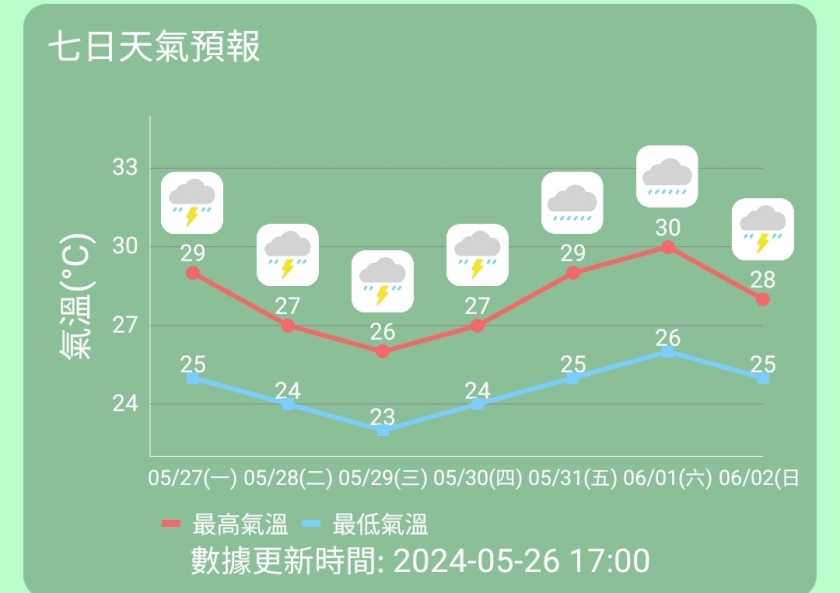 周二天氣維持多雲、有驟雨及雨勢有時頗大,並有雷暴,吹三至四級西至西南風及有陣風,氣溫約為24度至27度;根據氣象局公佈的未來七日天氣預報,周中至下周初本澳仍然有雨,周三至周四天氣大致多雲及間中有驟雨,並有幾陣雷暴,預料雨勢稍有減弱,吹三至五級偏東風及有陣風,氣溫約為23度至27度。