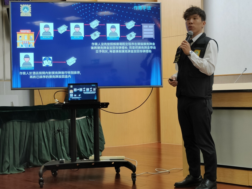 本月23日下午司警接獲路氹某賭場的代表報案,指早前發現鄭某及譚某以偷換撲克牌方式串謀多人詐騙賭場。