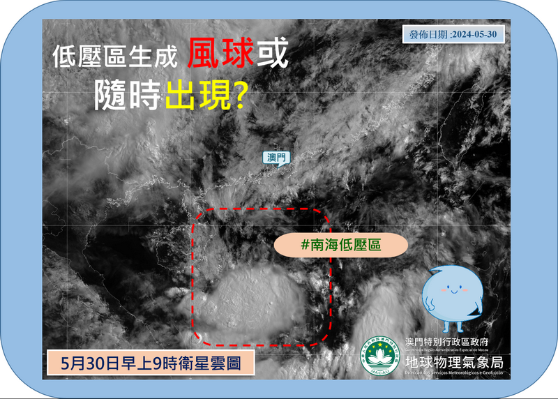 【本報消息】南海中部一道廣闊低壓槽相關的對流雲團,在周四下午發展成為低壓區後進一步增強為熱帶氣旋,氣象局也宣佈在下午五時半懸掛一號風球,預料該熱帶氣旋未來一兩日將靠近華南沿岸。受其影響,本澳未來兩日(5月31日及6月1日)將有驟雨及雷暴,風勢會較大。