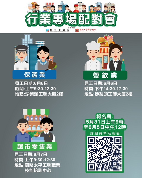 其中6月6日上午舉辦保潔業配對會,提供126個職位空缺,涉及巡更主任、押運隊長、編更員、電子及保安系統維修員、機場安檢員及清潔員。同日下午舉辦餐飲業配對會,提供145個職位空缺,涉及餐廳經理、收銀主任、烘焙領班、廚師、廚師助理、製餅員、樓面服務員、貨車司機及物流助理等。以上兩場配對會在工聯二樓(沙梨頭海邊街2-6號工聯大廈)舉行。