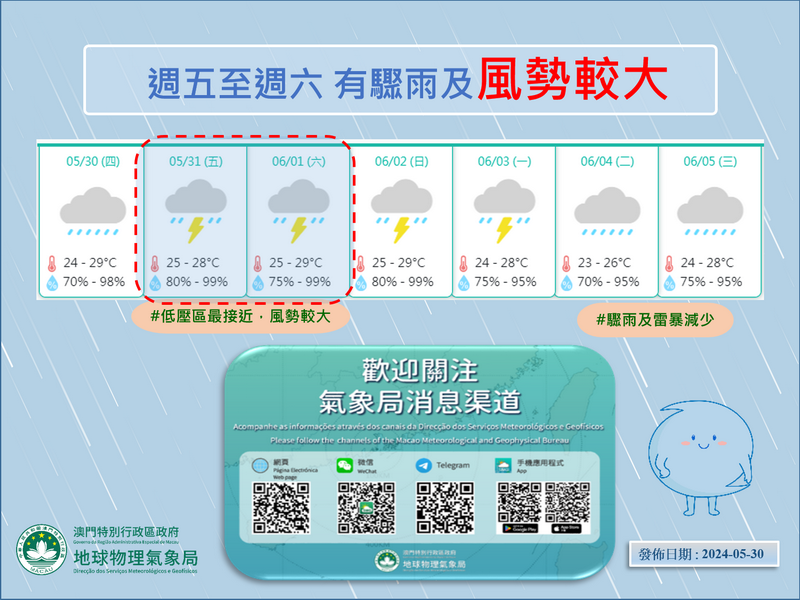 氣象局又指雖然現時低壓區的發展可能出現較大的變化,但可以確定的是,受其影響,本澳周五及周六的天氣將會變得不穩定,會有驟雨及雷暴,風勢會較大。其中周五開始本澳驟雨將漸轉頻密,稍後雨勢有時頗大及有雷暴,累積雨量較高。另外,未來兩日並非天文大潮,疊加風暴潮的影響較小,但在持續降雨的情況下低窪地區有機會出現水浸,市民應留意最新天氣資訊。