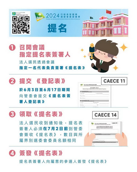 管委會日前中午舉行會議,宋敏莉向記者介紹選務工作進展時指出,根據選舉日程,法人選民須於6月3日至17日期間向管委會呈報簽署提名表的代表以領取提名表,以及於6月3日至7月2日期間提交法人投票人名單登記表,之後方可於是次選舉中行使提名權和投票權。
