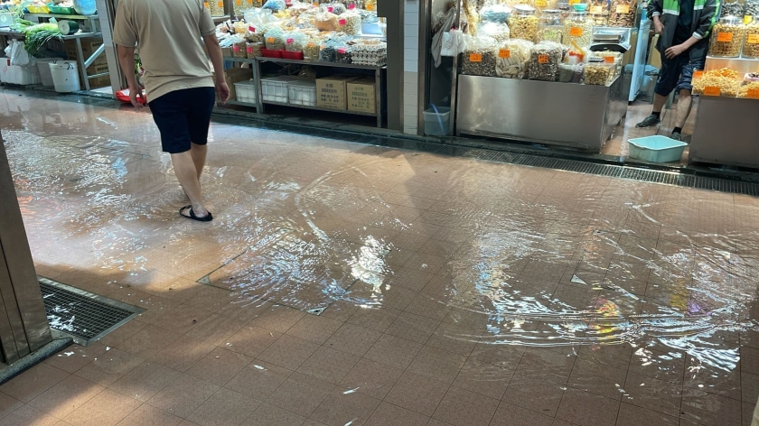 剛完成兩年翻新整治重新營業的紅街市在暴雨期間也出現渠水反湧情況,提柯坊會人員到場了解,有檔販反映地面層花園仔位置在暴雨期間,因內部水渠反湧而出現水浸情況,部分水管亦出現漏水,促請相關部門盡快處理紅街市內渠道問題,以及高士德區的渠網降低水浸發生機率。