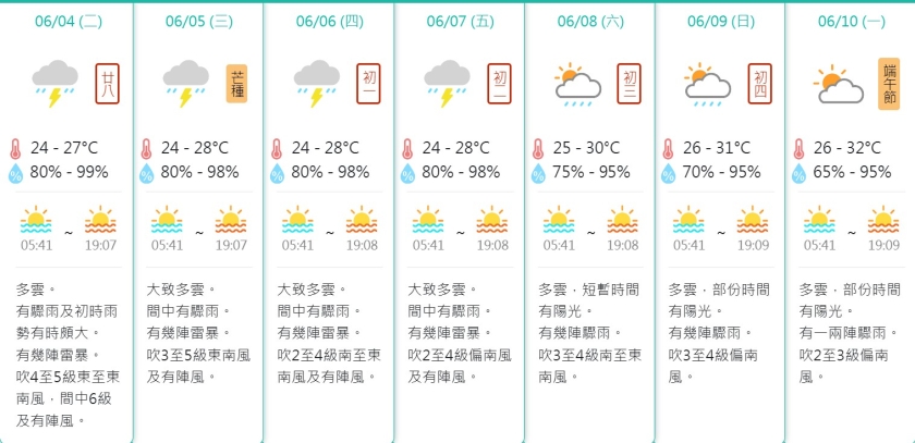 展望周三至周五驟雨仍較為頻密,並會有雷暴,但周六起天色會有改善並短暫出現陽光,預料下周一端午節起天色會開始逐漸明朗,但仍會有一兩驟雨,最高氣溫會重上32度。