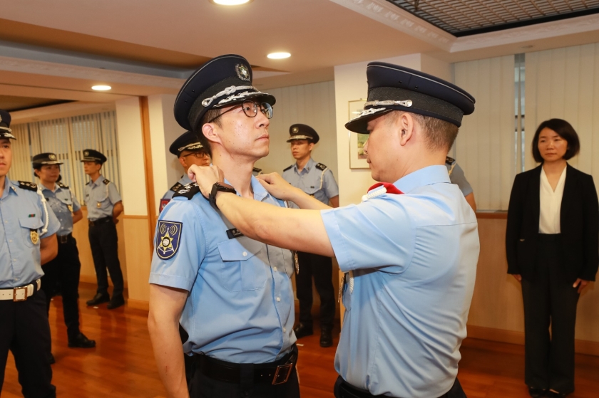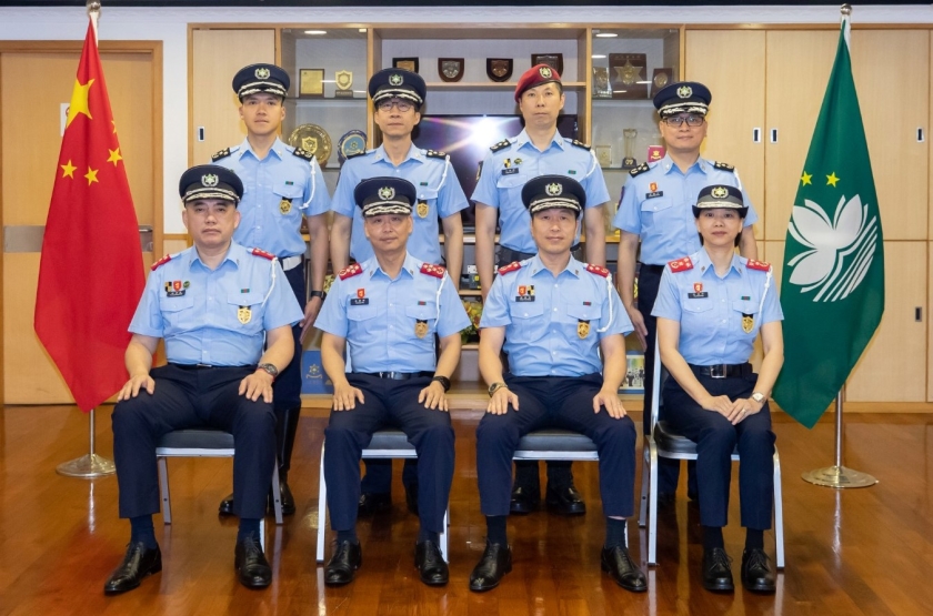 【本報消息】治安警察局6月3日下午舉行了警務總長、副警務總長及警司晉升儀式。儀式由局長吳錦華主持,副局長黃偉鴻、梁慶康、伍素萍及各部門主管亦出席儀式,為晉升同僚致賀。