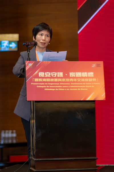是次交流座談會以「食安守護、家國情懷」為主題。國家海關總署動植檢司植檢二處三級主任科員趙倩、拱北海關食安處處長宦萍在會上,向與會的本澳青年代表介紹供澳鮮活食品監管情況、國家食品安全監管整體方向及食品進出口監管要求等,讓本澳青年對供澳鮮活食品及農產品的食安監管、貨源組織、區域食安合作等工作有進一步的瞭解。