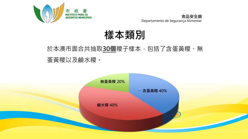 本次抽檢的糉子樣本共30個,包括含蛋黃糉、無蛋黃糉及鹼水糉,所有樣本均進行了微生物與化學檢測。其中,微生物檢測項目包括沙門氏菌、金黃色葡萄球菌、蠟樣芽孢桿菌,並因應鹼水糉及含蛋黃糉的製作特點,分別加驗硼酸和蘇丹紅的化學檢測項目。所有樣本的檢測結果均未見異常。