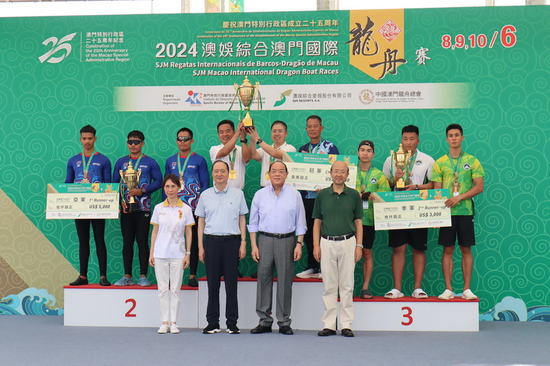 【本報消息】由體育局、澳娛綜合及中國澳門龍舟總會主辦,市政署及行政公職局協辦的「慶祝澳門特別行政區成立25周年—2024澳娛綜合澳門國際龍舟賽」,周一端午節正日上演多場邀請賽,經過連場競逐後,中國南海九江成功衛冕公開組及女子組冠軍,聊城大學就在大學生邀請賽中奪得冠軍。體育局局長潘永權表示,今屆賽事加設龍舟嘉年華活動,三日賽事錄得近六萬人次到場和參與嘉年華,他又提到國際龍舟聯會主席親身來澳觀賽,期望往後能與澳門有更多互動。