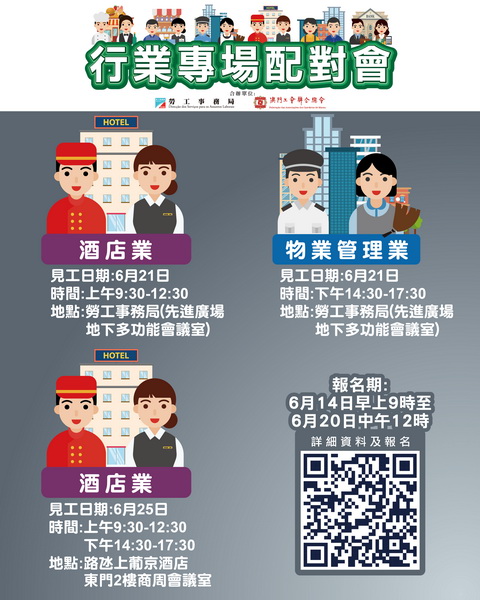 6月25日全日舉辦酒店業配對會,提供169個職位空缺,涉及餐廳經理(西式/澳葡/亞洲餐廳)、餐飲領班、總廚(宴會/澳葡/亞洲餐)、管事主任、廚師(中餐/西餐/亞洲餐)、餐飲服務員及調酒師等。