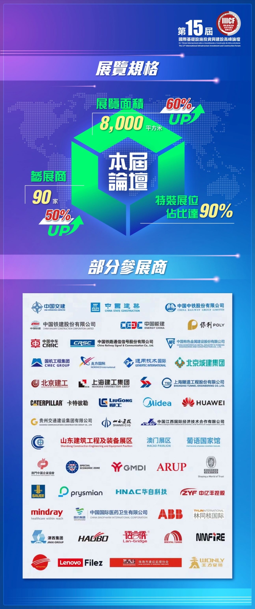 本屆國際基建論壇展覽面積同比增長六成,擴大至8,000平方米,展示規模為歷屆之最,90家基礎設施建設與投資相關的企業機構,將於一連三日的展覽中展示行業高端裝備、先進技術、典型案例等多項成果,同時也將展出合適澳門市場需求的工程技術、機電裝備和服務產品,展現中國建設品牌國際影響力同時,進一步發揮澳門中葡平台和會展等方面的優勢,為全球基建業界搭建交流合作平台。