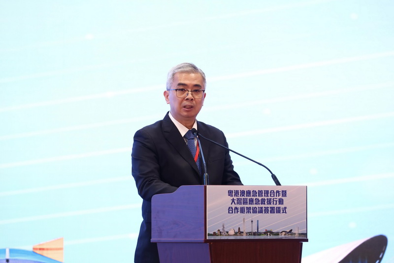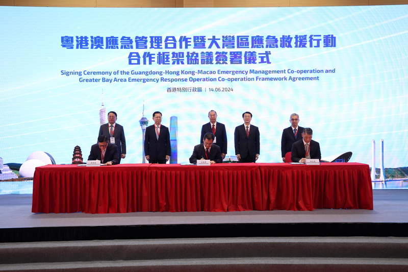 簽署儀式在國家應急管理部副部長徐加愛、國務院港澳辦室務會成員向斌、廣東省常務副省長張虎、香港政務司司長陳國基及澳門保安司司長黃少澤共同見證下,分別由廣東省應急管理廳廳長王再華、香港保安局局長鄧炳強及澳門警察總局局長梁文昌代表粵港澳三地政府簽署。