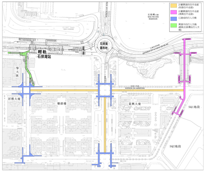 公建局指經綜合考慮石排灣現有和計劃興建的行人天橋的服務範圍、區內街道的規模及現有建築物的情況等,計劃增建「和諧大馬路空中走廊」,分別在和諧廣場及和諧大馬路的中央位置加設空中走廊,並與現有行人天橋連接,為實現以步行方式通往區內東西向和南北向的通達創造條件。