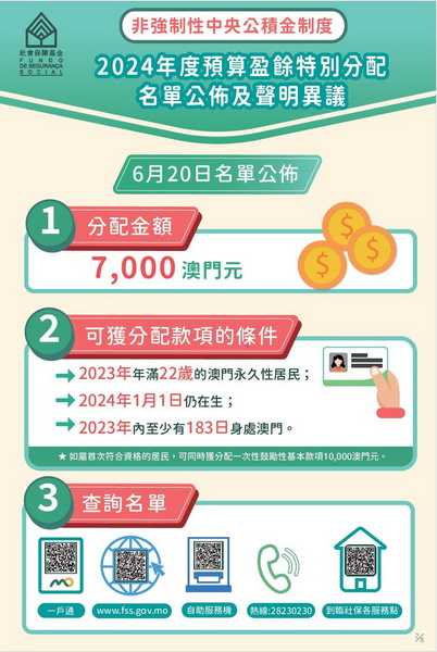 非強制央積金2024年度預算盈餘特別分配款項名單將於周四早上九時公佈,居民可透過「一戶通」、社保基金網站www.fss.gov.mo、自助服務機或24小時語音熱線2823 0230等查詢名單。