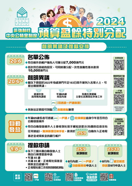 根據規定,凡2023年內年滿22歲且至少有183日身處澳門的永久性居民,2024年一月一日仍在生,均可被列入2024年度預算盈餘特別分配款項名單,獲分配7,000元,無須辦理任何手續;如為首次獲分配款項,將同時獲分配一次性鼓勵性基本款項10,000元。