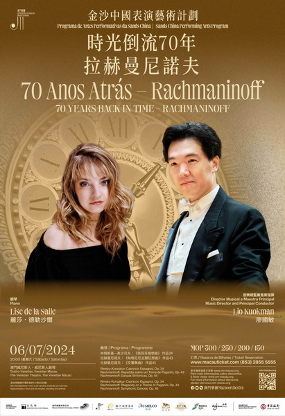 【本報消息】由文化局、澳門樂團、金沙中國表演藝術計劃呈獻的澳門樂團《時光倒流70年—拉赫曼尼諾夫》音樂會,將於7月6日晚上八時在澳門威尼斯人劇場上演。澳樂音樂總監兼首席指揮廖國敏聯手法國鋼琴家麗莎.德勒沙爾,為觀眾呈獻俄國作曲家林姆斯基—高沙可夫和拉赫曼尼諾夫三首作品,門票現正於澳門售票網發售。