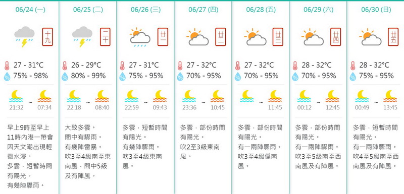 鄰埠香港天文台亦預測位於南海中至北部的廣闊低壓槽會在未來一兩日為廣東沿岸至海南島一帶帶來驟雨及雷暴。隨著副熱帶高壓脊在本周中後期向西伸展,華南沿岸地區天氣酷熱。預料受西南氣流影響,周末至下周初廣東沿岸天氣炎熱及有驟雨。