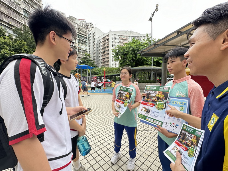 6月15日至21日期間,司警局關注少年組人員聯同多間學校的代表、兩項青年計劃學員,分別前往本澳各區學校周邊、公園、休憩區、運動場及自由波地等地點派發宣傳單張,向青少年傳遞防罪訊息,尤其有關「睇波不賭波」以及切勿參與非法博彩的資訊,冀能透過朋輩影響力,將防罪拒賭訊息於青少年群體中廣作傳播,提升他們的知法守法意識。
