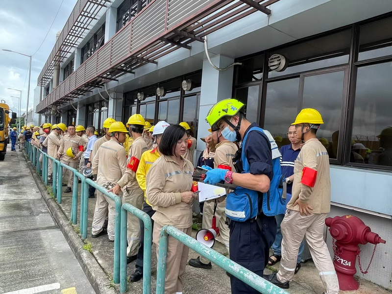 消防局接報後,隨即派遣九輛緊急車輛及34名人員趕赴現場,並按行動預案展開滅火救援及疏散工作,並對一名疏散期間受傷的員工進行護理,及後模擬送院治理。