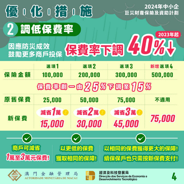 即日起中小企可透過參與2024年度巨災保險的五間本地保險公司,為每一營業場所投保一份巨災保險。設有四個投保金額供商戶選擇,分別為澳門元10萬元、20萬元、30萬元以及去年增設的50萬元。未曾索賠的商戶今年繼續享有續保的保費折扣,最高可享折扣高達35%。