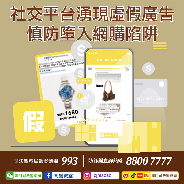 司警局反詐騙協調中心呼籲市民慎閱網上社交平台所有推送之「贊助」廣告,提防騙徒以虛假帳號購置廣告行騙;進行網購時便宜莫貪,以免誤墮網購陷阱;如有懷疑,可使用司警局反詐程式查詢風險指數或上報資料,又或致電司警局防詐騙查詢熱線88007777或報案熱線993求助。