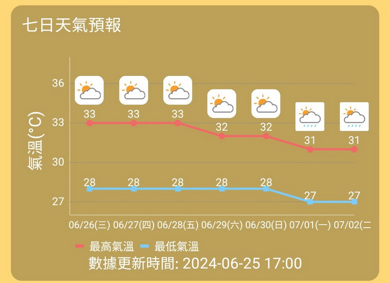 氣象局已發出黃色高溫提示,預料本澳未來數日天氣持續酷熱,預料周四至周五日間最高氣溫可達至33度,全日最低氣溫約28度,天晴但部份時間多雲。根據當局的七日天氣預報,暫時預測周六起本澳會再度出現驟雨天氣,並且至少持續至下周二,最高氣溫略為下降至31度至32度,多雲及短暫時間有陽光。