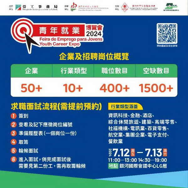 【本報消息】由勞工事務局主辦,新青協辦並由澳學聯及青發中心支持的「青年就業博覽會 2024」,定於7月12日至13日假銀河國際會議中心舉行。今年主題為「展.未來新視界、探.就業新動向」,活動內容包括就業配對、講座路演、科技體驗、技能展示、政策宣講和職涯諮詢六大元素。