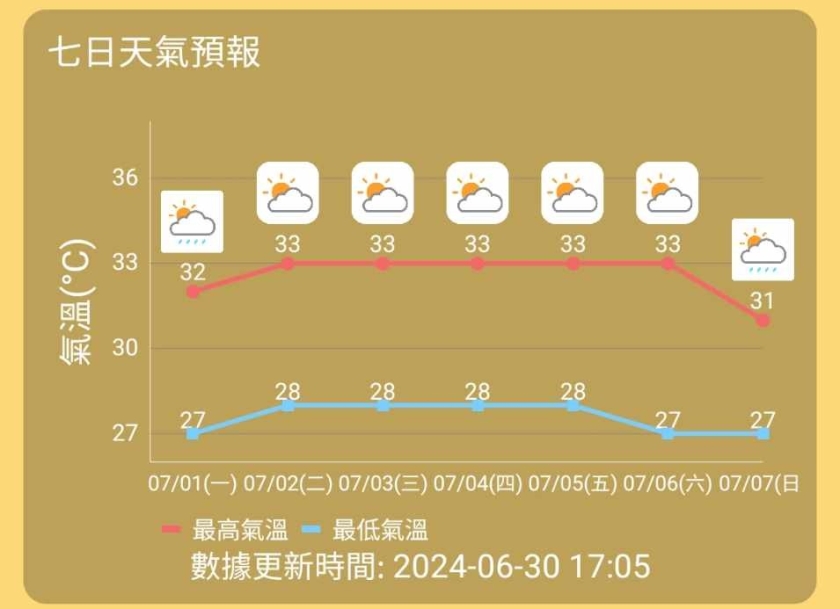 氣象局預期周二驟雨會有所減少,天晴但部份時間多雲,有一兩陣驟雨,吹四至五級偏南風,間中六級及有陣風,氣溫約為28度至33度。當局預測周三至周六「小暑」節氣的天氣都會維持酷熱,天晴部份時間多雲,氣溫同樣約為28度至33度。根據氣象局的七日天氣預報,暫時預測下周日本澳又會有幾陣驟雨,最高氣溫稍微下降至約31度。