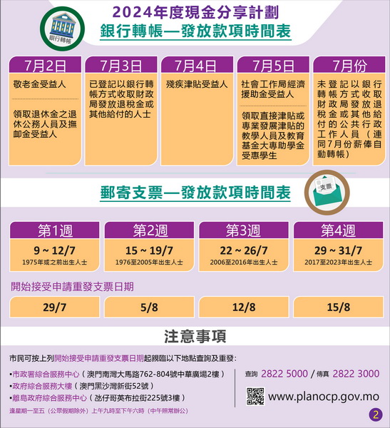 其餘合資格獲發放2024年度現金分享計劃款項的人士則自7月9日起通過平郵方式寄送劃線支票,支票只可存入受益人的帳戶。18歲以下未成年受益人所收到的支票除可存入受益人帳戶外,亦可存入受益人父親或母親的帳戶。