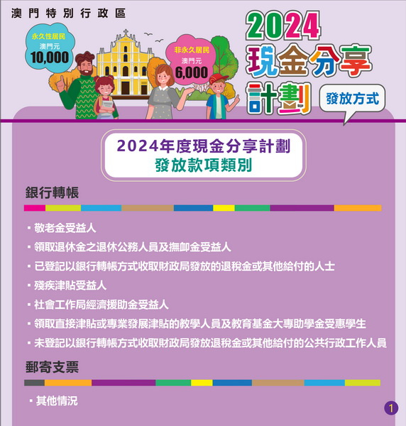 由即日起透過銀行轉帳發放的受惠對象包括敬老金受益人、領取退休金之退休公務人員及撫卹金受益人、已登記以銀行轉帳方式收取財政局發放退税金或其他給付的人士、殘疾津貼受益人、社會工作局經濟援助金受益人、領取直接津貼或專業發展津貼的教學人員及教育基金大專助學金受惠學生、未登記以銀行轉帳方式收取財政局發放退税金或其他給付的公共行政工作人員,以上凡合資格獲發放2024年度現金分享計劃款項之人士,將透過銀行轉帳形式發放。