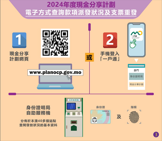 為方便居民查詢收取現金分享款項的狀況,居民可連結《現金分享計劃》專頁(www.planocp.gov.mo)或登入一戶通查詢個人發放資料,或未能符合法律規定《現金分享計劃》發放條件的原因。亦可使用身份證明局分佈於本澳40多個站點的自助服務機,以身份證及指模驗證後,即時得知發放狀況的基本資料。