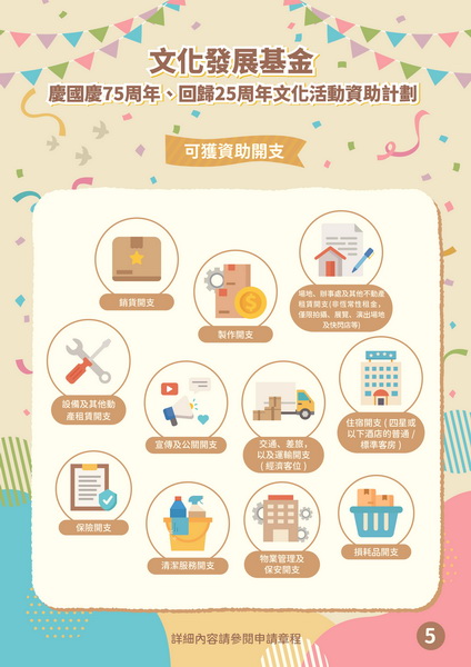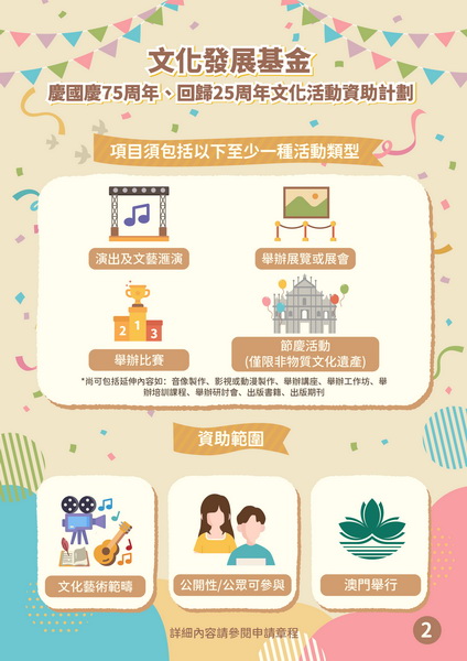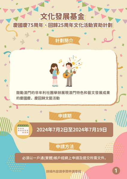 【本報消息】為慶祝中華人民共和國成立75周年、澳門回歸祖國25周年,文化發展基金推出「慶國慶75周年、回歸25周年文化活動資助計劃」,鼓勵澳門依法成立的非牟利社團舉辦展現澳門特色和藝文發展成果的慶國慶、賀回歸的文藝活動,提升全澳門的喜慶氛圍,進一步推動社會廣泛參與,同賀雙慶盛事。