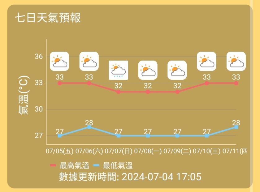 當局預測周六「小暑」節氣本澳天氣繼續酷熱,天晴但部份時間多雲,以及有一兩陣驟雨,最高氣溫會有33度;下周初副熱帶高壓減弱下最高氣溫會稍微下降一度,天氣暫時轉為多雲,部份時間有陽光,並有一兩陣驟雨。展望下周中起最高氣溫會重上33度,天氣會再度變得天晴酷熱。