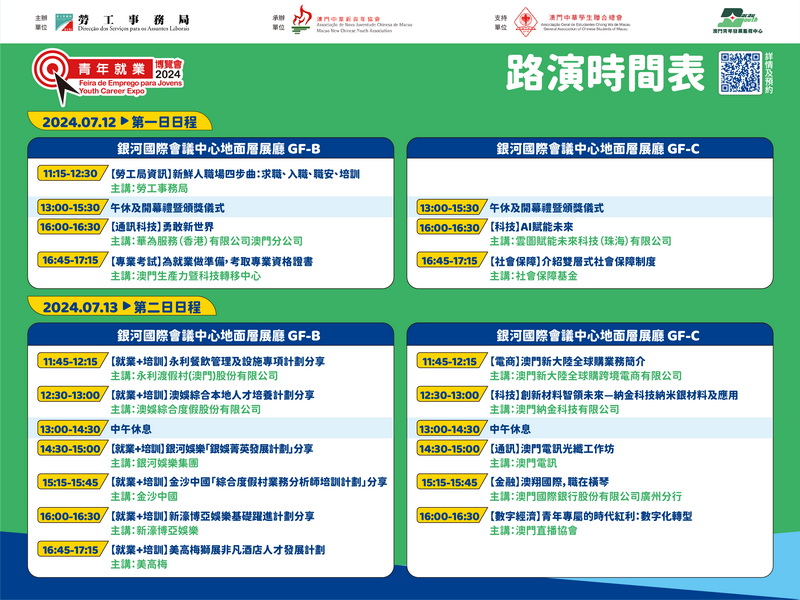 活動期間,主辦單位邀請了10位與四大產業相關業界代表主講1+4行業講座,向青年講解產業發展新動向,並分享個人職業發展經歷,為青年職涯發展提供建議。期間又會舉辦五場論壇,當中兩場邀請深合區民生事務局領導主管人員、落戶深合區內地龍頭企業的高管人才,與青年對話探索就業新動向,並分享在深合區的發展機遇與相關政策;其餘三場亦邀請了本澳創新企業和公共事業機構的資深人資顧問,為澳門青年介紹企業培養青年人才的相關計劃。活動同時將舉辦17場路演,為青年與參展企業和機構之間搭建溝通平台。