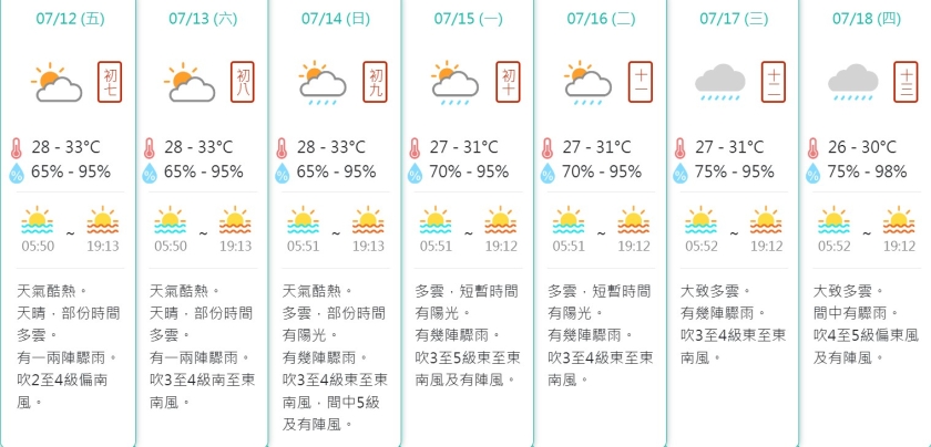 展望下周一起天氣轉為多雲為主,短暫時間有陽光,並有幾陣驟雨,氣溫介乎27度至31度之間;下周中陽光又會暫時休息,令最高氣溫將下降至約30度左右,雖然可以緩解暑氣,但驟雨亦會隨之增多。
