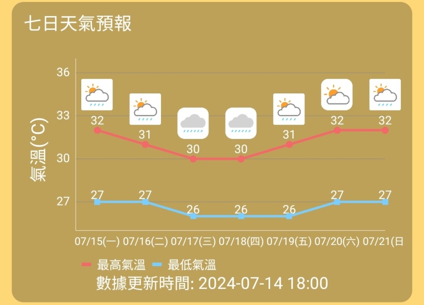 周三至周四本澳將轉為多雲天氣,間中有驟雨,並且可能有雷暴出現,在太陽休息下最高氣溫亦可望再下降至30度,但要留意間中會有六級的東至東南陣風出現。當局暫時預測由周五起天氣有所改善,降雨減少並短暫時間有陽光,氣溫也會逐步上升。