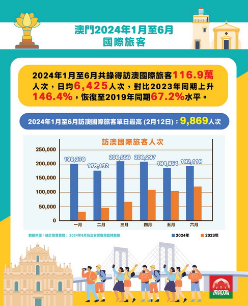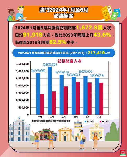 根據臨時數據顯示,今年頭六個月本澳的入境旅客約1,672.9萬人次,日均近9.2萬(91,918)人次,較2023年同期上升43.6%,並恢復至2019年同期82.5%水平。