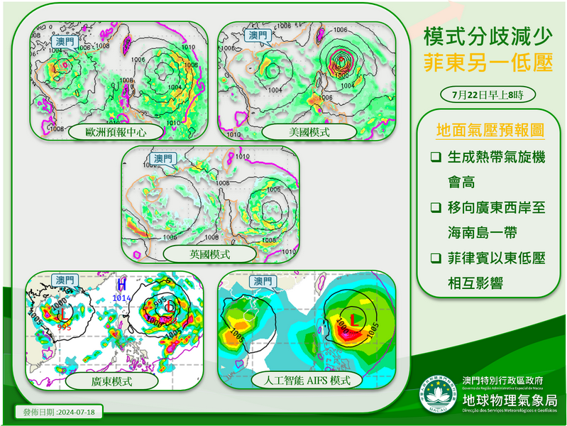 氣象局指根據最新的預報資料顯示,各模式對低壓區進入南海後的發展,較早前的預報分歧減少,並均預料將進一步增強為熱帶氣旋。然而,由於菲律賓以東還有另一低壓區亦正在發展中,且預料增強的速度較為迅速,因此,兩個系統之間或會相互影響,以致南海低壓區隨後的移向及強度發展仍存較大的不確定性。