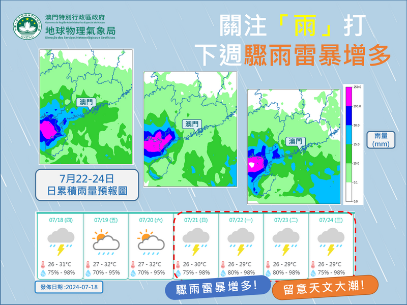 此外,下周初(21至23日)適逢天文大潮,如南海低壓區最終發展為熱帶氣旋且靠近珠江口,在疊加風暴潮影響,又或者出現持續大雨的情況下,低窪地區或會出現水浸。就此,面對未來一周複雜多變的天氣,氣象局呼籲市民及早規劃防風防水浸的應對措施,並持續關注局方的最新天氣資訊。