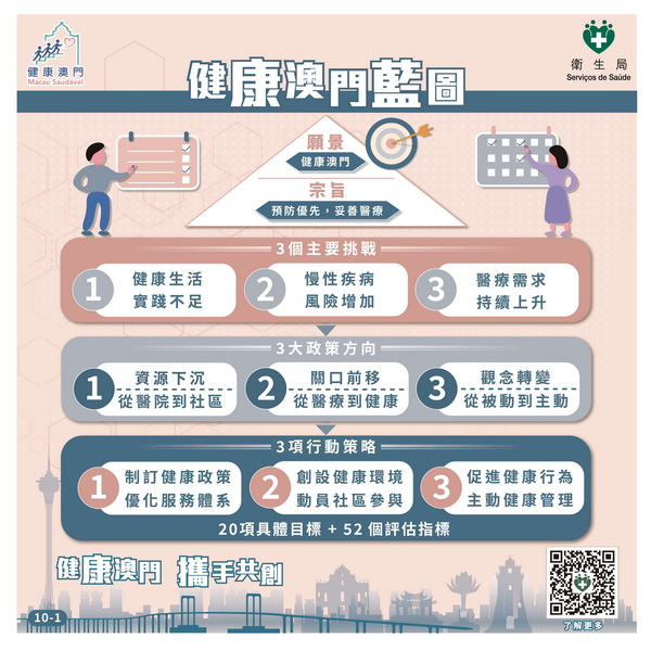 當局又期望社會上下共同貫徹落實《藍圖》各項工作,讓澳門在2030年能達致全民健康素養有所提升、健康生活方式基本普及、重大慢性病得以控制、居民生活質量持續改善的總體目標。