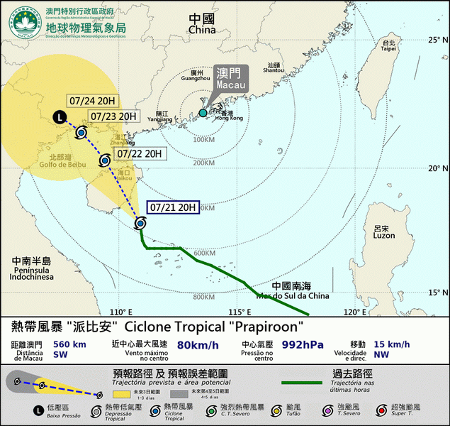 於南海中部生成的熱帶氣旋「派比安」周日由熱帶低氣壓增強至熱帶風暴,由於「派比安」早上一度採取偏西方向移動,稍微拉遠了與本澳的距離,下午則轉為西北偏北方向移動,強度有所增強,氣象局預測「派比安」將會於周一凌晨至早上於海南島登陸,並且會與本澳會保持超過400公里距離。
