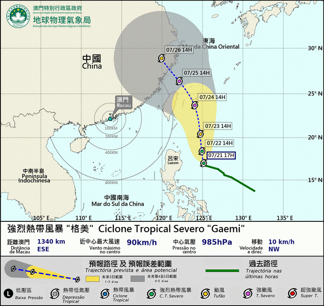 此外,菲律賓以東海域亦形成了熱帶氣旋「格美」,並在周日增強為強烈熱帶風暴,大致趨向台灣地區以東海域,並將繼續增強,預料周中最高會增強至颱風級別;雖然「格美」與「派比安」雙颱共舞,但由於「格美」採取偏北方向移動,預料對本澳不會造成影響。