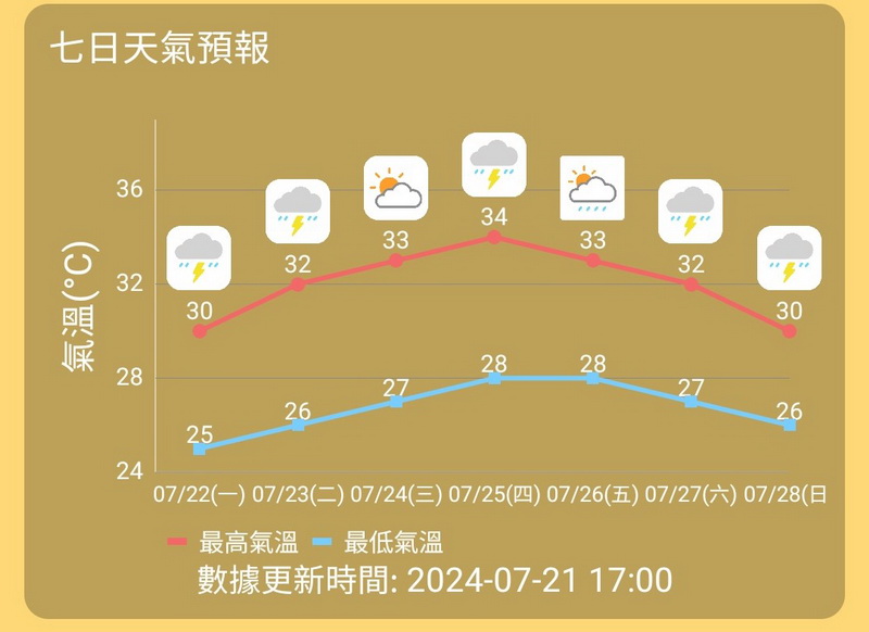 「格美」雖然不會趨向本澳,但受其外圍下沉氣流影響,氣象局預告本澳周二最高氣溫會回升至32度或以上,多雲及短暫時間有陽光,但仍然會有雷驟雨,吹三至五級南至西南風及有陣風;周三至周五天氣酷熱,最高氣溫會上升至約34度,多雲有陽光,並有幾陣驟雨及雷暴。