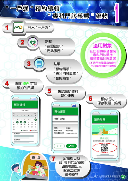 【本報消息】為配合特區政府電子政務發展,推動智慧醫療,進一步便利就診者或代領人領取仁伯爵綜合醫院專科門診藥物和縮短輪候領藥時間,衛生局於7月23日起優化一戶通預約續領「專科門診藥房」藥物服務。