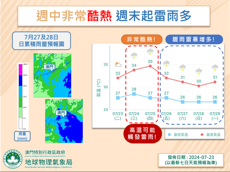 根據氣象局未來一周天氣預告,周三天氣酷熱、天晴,部份時間多雲及稍後有幾陣驟雨並可能有雷暴,吹二至四級南至西南風及有陣風,氣溫約為28至34度,市區再高一兩度。相對濕度介乎百分之60至95之間,預測最高紫外線指數約為 12,級別屬於極高。