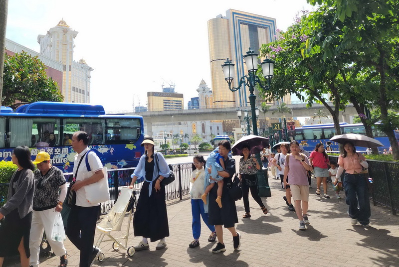 氣象局已發出黃色高溫提示,預料本澳未來數日天氣持續酷熱,而黃色高溫提示下,周二本澳多區在日間均錄得超過34度高溫,其中外港碼頭更錄得35.1度高溫。不過高溫並無阻遊客遊澳興緻,市區不時可見到遊客在做足防曬降溫措施下,繼續展開遊澳打卡購物旅程。