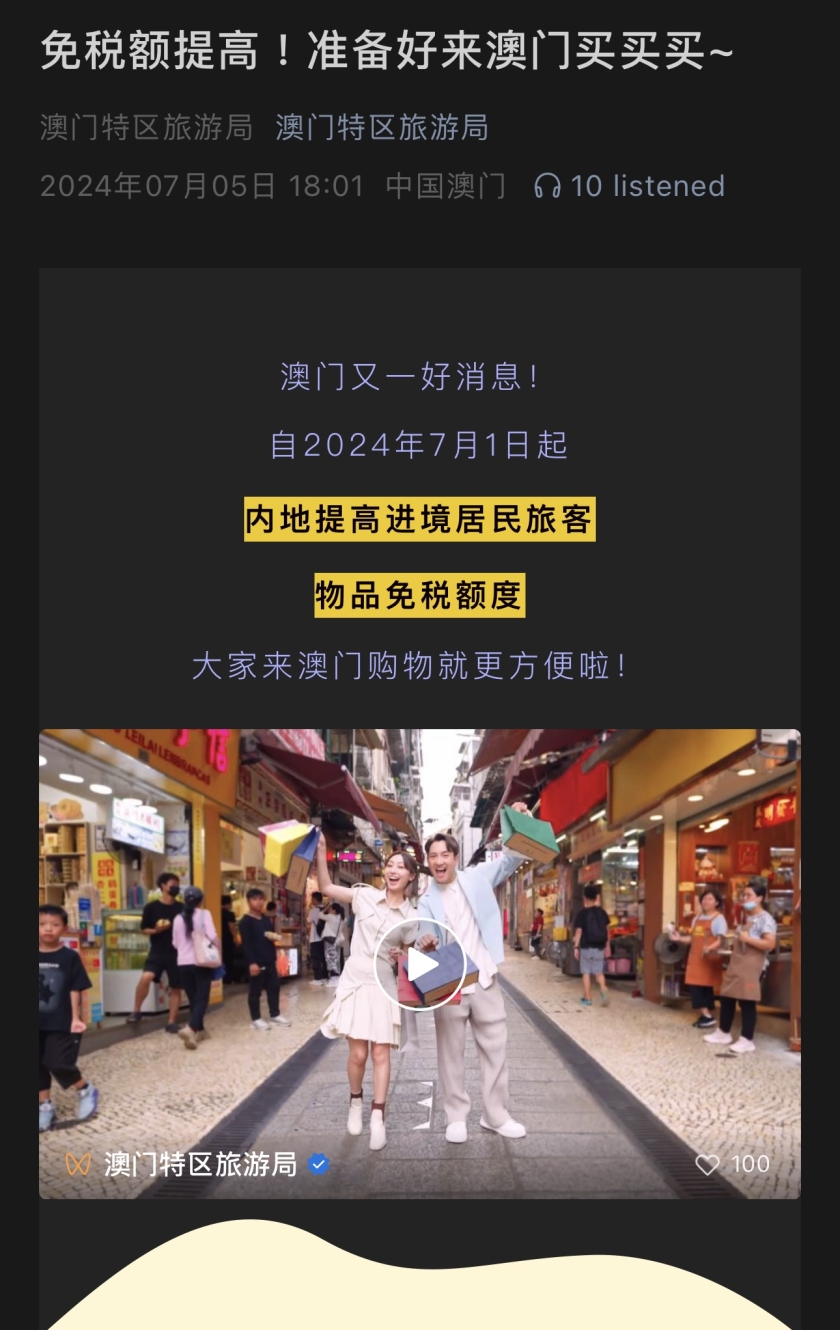 旅遊局表示,因應中央惠澳新舉措的機遇,局方在七月初開展線上線下全方位宣傳,擴大內地客源。因應措施現擴展至全部進境口岸,加上暑期旺季,旅遊局加強宣傳,積極推廣刺激消費,包括在微信、微博、抖音和小紅書等官方社交平台宣傳,目前曝光量逾522萬;加強在內地主流媒體及邀請小紅書博主推送宣傳;與旅遊達人、內地大型旅遊平台包括去哪兒、同程和途牛,以及主流網絡搜尋平台合作;製作宣傳短片,持續在旅遊局各口岸旅客詢問處及官方社交平台播放。