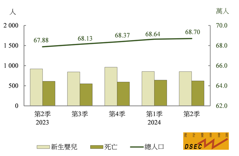 按季分析,第二季新生嬰兒853名、死亡人數621人及結婚宗數725宗,按季分別減少3名、19人及212宗。當季從中國內地持單程證的新來澳人士845人按季增加119人;新批給的准許居留人士199人則減少73人;期末外地僱員181,108人則增加1,639人。