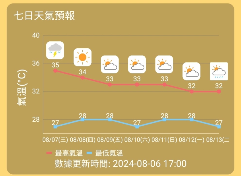 周三是中國傳統24節氣的「立秋」,傳統上是秋季的開始,但對澳門而言是全年最熱的節氣,即坊間戲言「秋老虎」開始出沒的日子。氣象局預料周三本澳天氣酷熱,多雲,部份時間有陽光,稍後有幾陣驟雨及雷暴,吹二至四級西南風及有陣風,氣溫約為27至35度,市區再高一兩度,相對濕度介乎百分之60至95之間,預測最高紫外線指數約為11,級別屬於極高。
